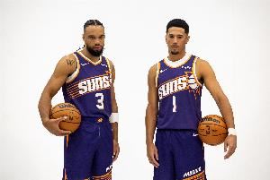 他出场26分34秒,17投7中(三分10中5),罚球2中2,拿到21分3篮板2助攻2抢断,布克投篮10中5,三分球4中1,罚球7中7,拿到18分3篮板7助攻。